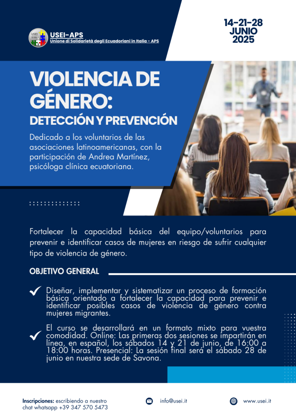 L’USEI-APS è una associazione di promozione sociale, composta da volontari senza scopo di lucro costituita nel dicembre 2008 da un gruppo di cittadini di origine ecuadoriana. Nasce come riferimento della comunità ecuadoriana per poi diventare riferimento di tutti gli immigrati presenti nel territorio.