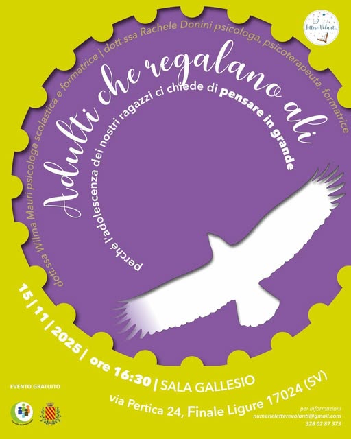 Una volta si parlava di adolescenti ribelli da domare, oggi di giovani fragili da proteggere sempre e comunque. Di certo quando si parla di adolescenti รจ urgente fare un grande sforzo per andare oltre al racconto che si fa di loro tra ansie, malesseri, aggressivitร , insicurezze e dipendenze. Di questo e di molto altro ancora si parlerร sabato 15 novembre al convegno organizzato dall’Associazione ยซRete Genitori Lettere Volanti Apsยป , in Sala Gallesio, in via Pertica a Finale Ligure alle ore 16.30. Il titolo รจ giร di per sรฉ molto significativo: ยซAdulti che regalano ali perchรฉ l’adolescenza dei nostri ragazzi ci chiede di pensare in grandeยป. Ne parleranno due prestigiose professioniste: la Dott.ssa Wilma Mauri e la dottoressa Rachele Donini.