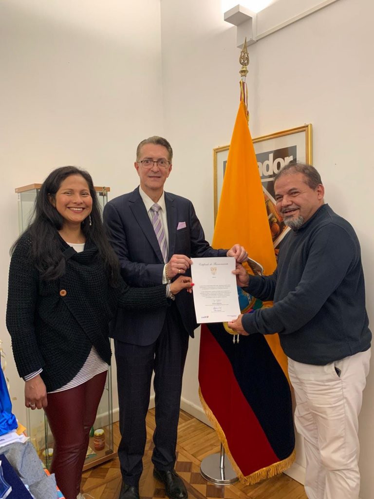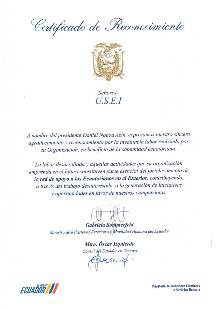 Presso il Consolato Generale dell’Ecuador, hanno partecipato alla presentazione del rapporto di gestione ai leader della comunitร da parte del Console Generale dell’Ecuador a Genova, Ministro Oscar Izquierdo. In questa occasione, il Console ha anche consegnato, a nome delle piรน alte autoritร del Governo dell’Ecuador, riconoscimenti ufficiali alle associazioni di migranti ecuadoriani a Genova, inclusa USEI-APS.