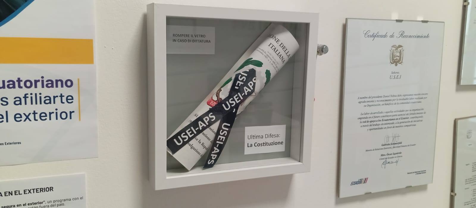 โ€œPresso la sede operativa dell’USEI-APS vogliamo esporre un significativo quadro intitolato ยซUltima Difesa: La Costituzioneยป, con la potente iscrizione ยซIn caso di dittatura rompere il vetroยป. Questo gesto simbolico racchiude un messaggio profondo: la Costituzione come faro di libertร  e bene comune, da custodire e diffondere con impegno.โ€