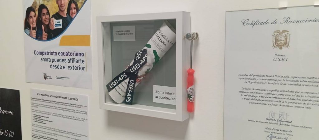Savona, 16 luglio 2025 โ€“ Si รจ svolta quest’oggi, presso la sede operativa dell’associazione USEI-APS (Unione di Solidarietร  degli Ecuadoriani in Italia โ€“ APS), la cerimonia di posa del significativo quadro intitolato ยซL’Ultima Difesa: La Costituzioneยป. L’evento, tenutosi in un formato intimo con la partecipazione di un selezionato gruppo di soci invitati, ha sottolineato l’importanza dei valori costituzionali.