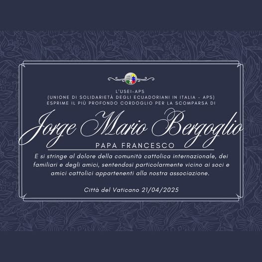 Savona, 21 aprile โ€™25 โ€“ L’associazione USEI APS (Unione di Solidarietร  degli Ecuadoriani in Italia โ€“ APS) si unisce al lutto mondiale per la morte di Jorge Mario Bergoglio (Papa Francesco), una guida spirituale che ha ispirato milioni di persone in tutto il mondo. Sebbene la nostra sia un’organizzazione laica, molti dei nostri soci sono cattolici e condividono i valori di umanitร  che Papa Francesco ha difeso.