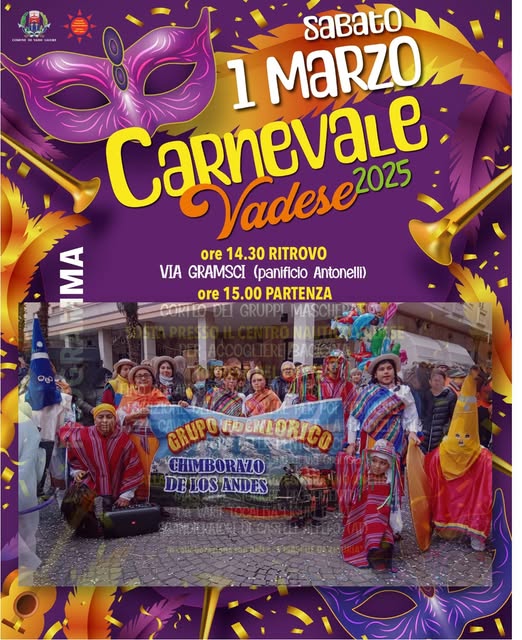 Sabato 1 marzo 2025, ore 15, Vado Ligure sarร testimone di una vibrante manifestazione di cultura e tradizione. Sotto l’egida dell’associazione USEI-APS (Unione di Solidarietร degli Ecuadoriani in Italia – APS), il rinomato Gruppo Ecuadoriano di Danza Folcloristica ยซChimborazoยป di Genova abbellirร la sfilata di Carnevale organizzata dal Comune di Vado Ligure e dalla Consulta del Volontariato Vadese.