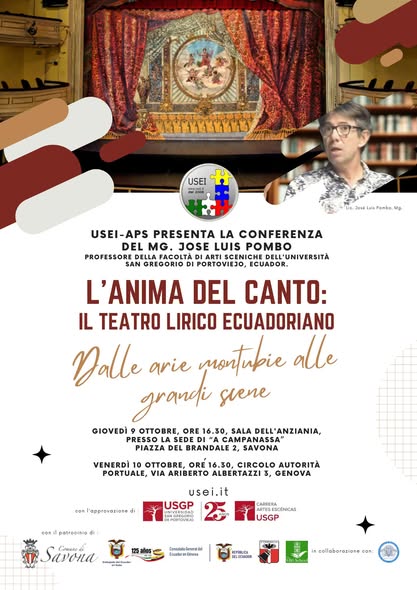 A nuestros socios y amigos de la comunidad ecuatoriana y latinoamericana de Savona y Gรฉnova, los invitamos a participar en la Conferencia del mรบsico y profesor universitario Mg. Josรฉ Luis Pombo, ยซL’anima del Cantoยป
