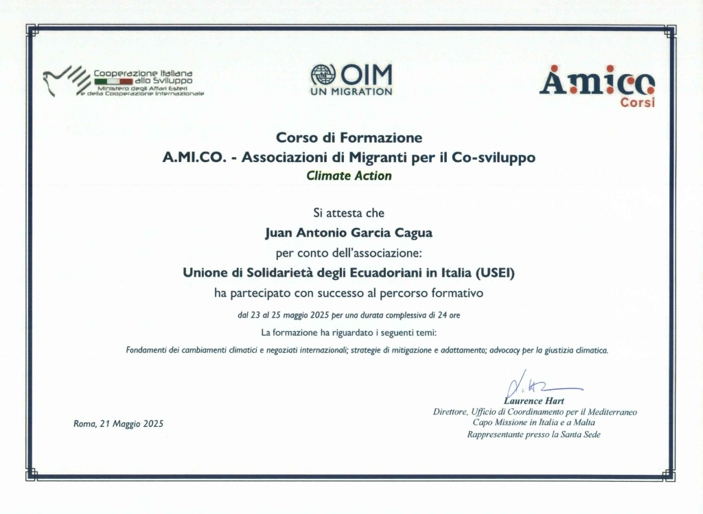Tra i partecipanti, era presente anche Antonio Garcia, Presidente dell’USEI APS (Unione di Solidarietà degli Ecuadoriani in Italia – APS), a testimonianza dell’interesse e dell’impegno delle comunità diasporiche italiane verso le sfide globali legate al clima.